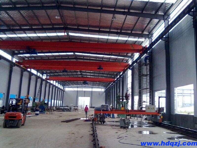 將單梁起重機主梁用吊車吊運至軌道上,根據廠房高度,選擇適當長的鋼絲繩,汽車吊梁與梁應盡量縮短吊繩長度,加大起吊高度。起吊期間注意人員的配合及安全。