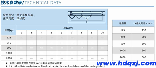 負荷達2000kg,主梁長度可達10米,吊點間距達9米。有125,250,500和1000四種不同規格的型軌
